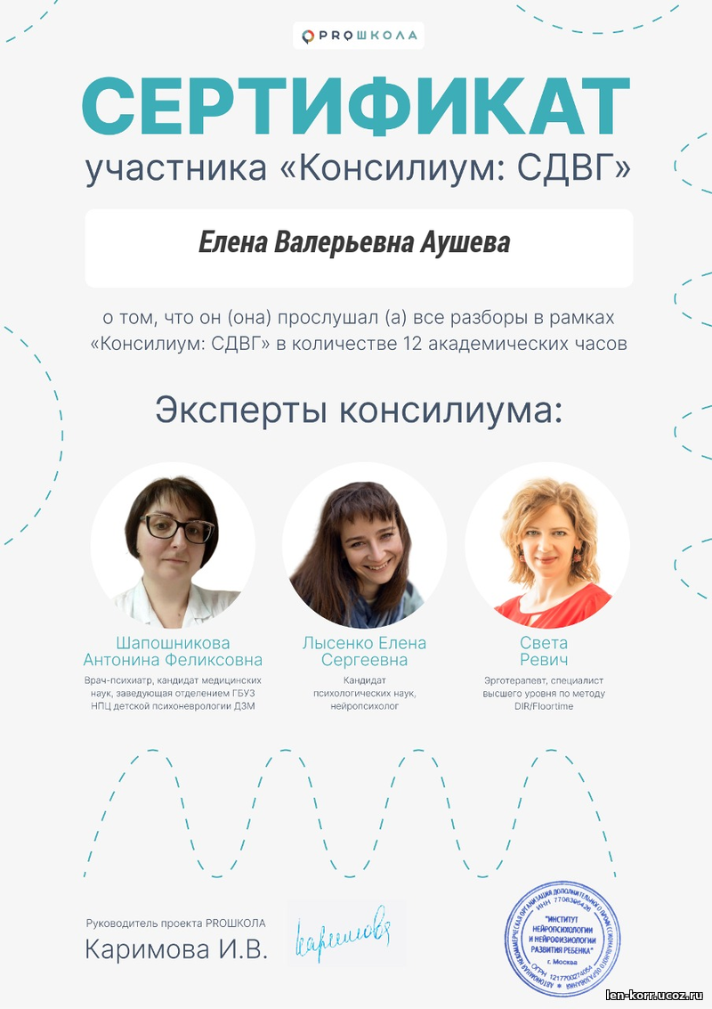 - 2024 год, Центр онлайн-обучения Всероссийского Форума "Педагоги России: инновации в образовании", дополнительная профессиональная программа "Профилактика детских деструктивных поведений: суицид, воровство, игромания"» в объеме 36 часов